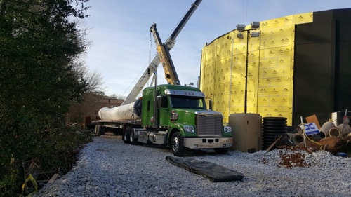After cyclorama conservators separated the painting along two existing seams, the two segments were wrapped around two 45-foot-tall custom-built steel spools and placed in a waterproof barrier. The spools were then individually lifted through two seven foot holes cut into the building’s roof, and placed on the 2-axle flatbed